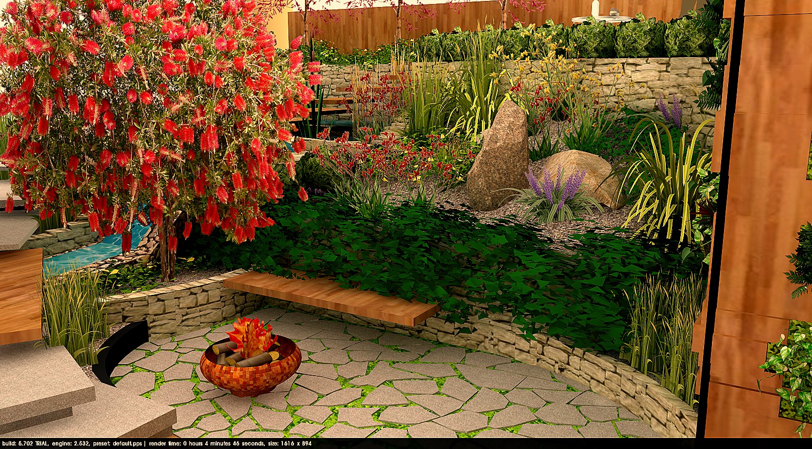 If required, the model can be passed to rendering software for higher resolution and softening. Note the loss of detail of graphic on the screen wall. This is a function of the renderer in use. It is possible to include the graphic on the rear wall in some ray tracing software.